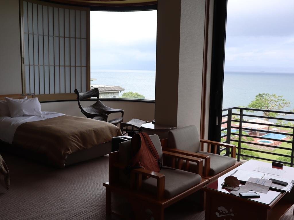 指宿で一番大きそうな宿「指宿白水館」まで車を走らせた。