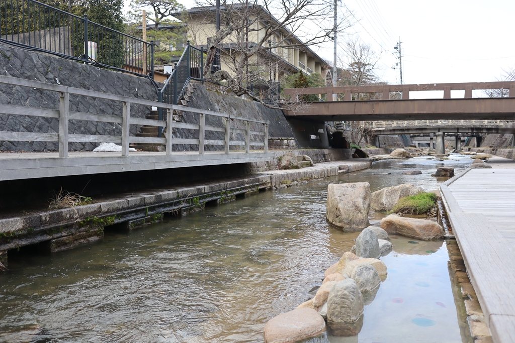 玉造温泉街は玉湯川を挟んで両岸に宿が並んでいて、その玉湯川ではかなり熱めの足湯が楽しめる。