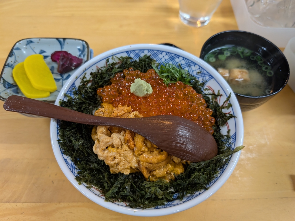 旅の最後の食事ということで、値段は気にせず好きなものを。ウニいくら丼3,300円。